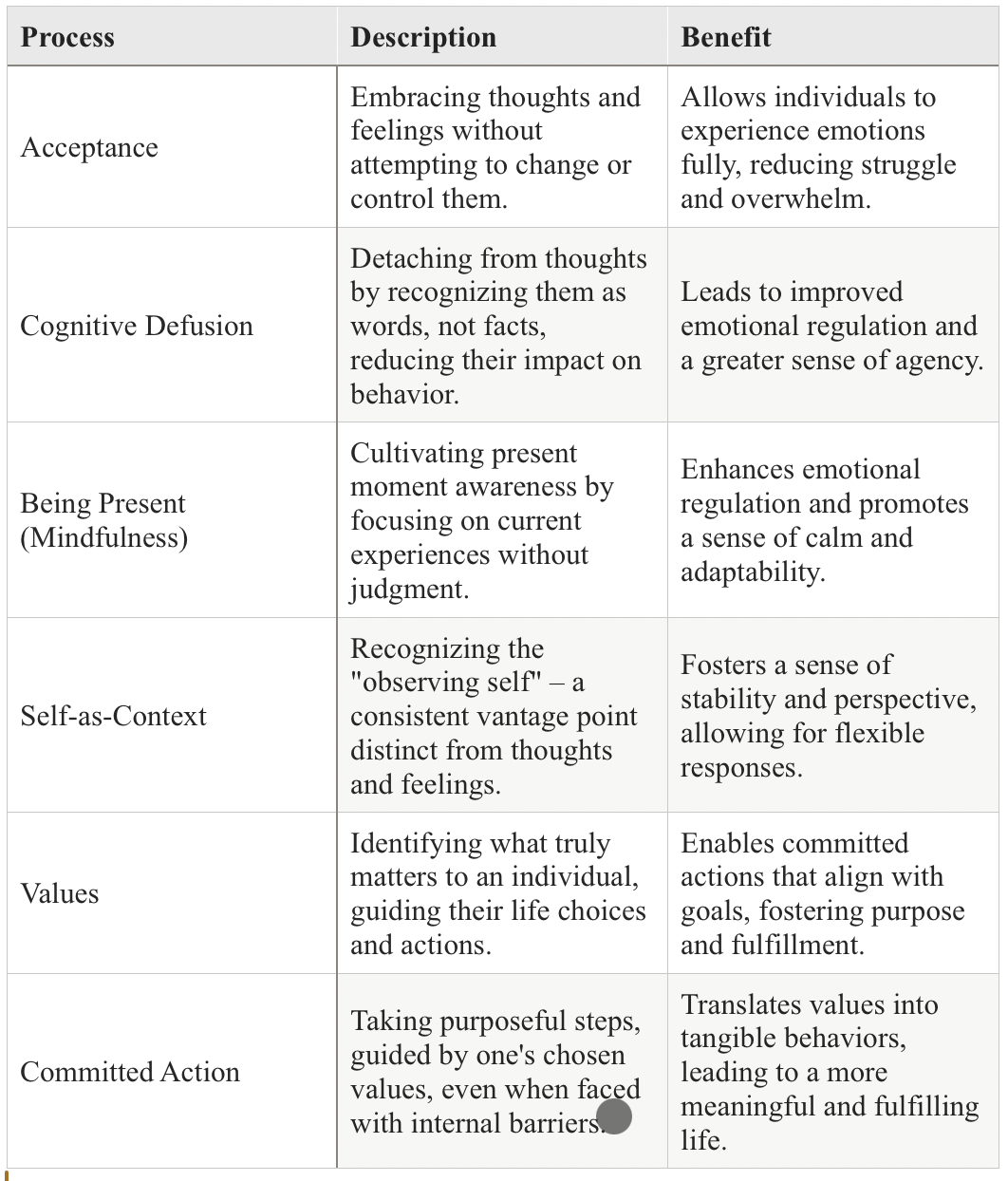 This table summarizes the core processes of the ACT Hexaflex model, highlighting their descriptions and benefits. Understanding these processes is crucial for effectively applying ACT in therapeutic settings.