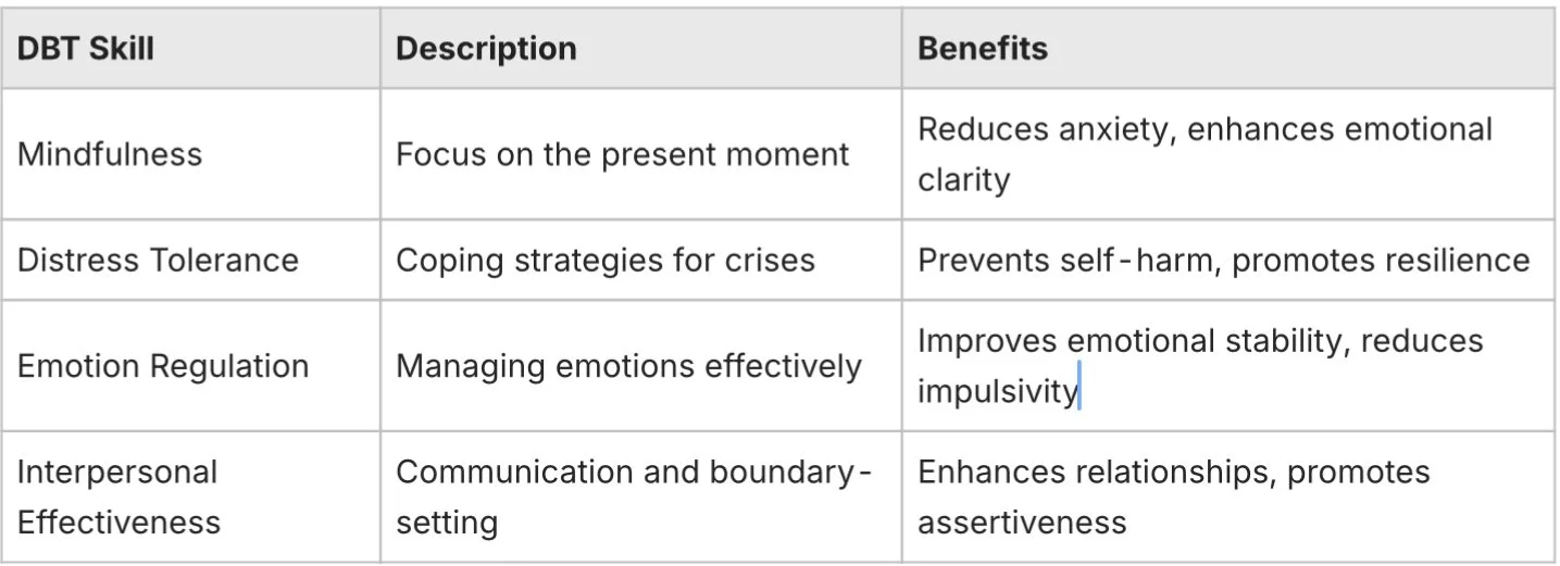 DBT provides a structured and effective approach to managing emotional dysregulation and improving interpersonal relationships. By focusing on skill development and practical applications, individuals can achieve significant improvements in their mental health and overall quality of life.